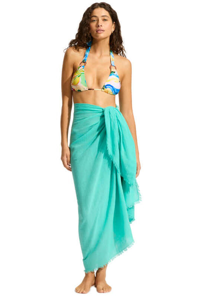 The Textured Cotton Beach Sarong in Aquatic Blue by beachwear designer Seafolly is the perfect wear-anywhere cover up for beachside, poolside and beyond. A perfect piece to layer over your favourite swim.