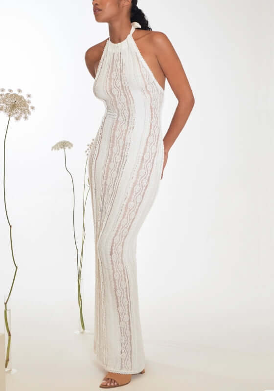 Introducing Thea Long Dress by resortwear designer Charo Ruiz in White - a sophisticated blend of feminine silhouette and sleek 90s-inspired design. The halter neckline flatters and accentuates your shape, while the fitted bodice creates a stunning, semi-transparent effect. Made with a combination of mesh and cotton, this beach dress is both elegant and comfortable.