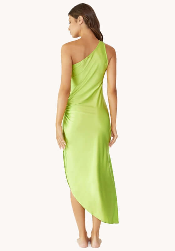 Make a style statement in the stunning Tinsley Dress in Lime by beachwear designer PQ Swim.   This silky one shoulder maxi beach dress features a ring detail at the side and split to the thigh.  Model wears a XS/S and is 5'9.