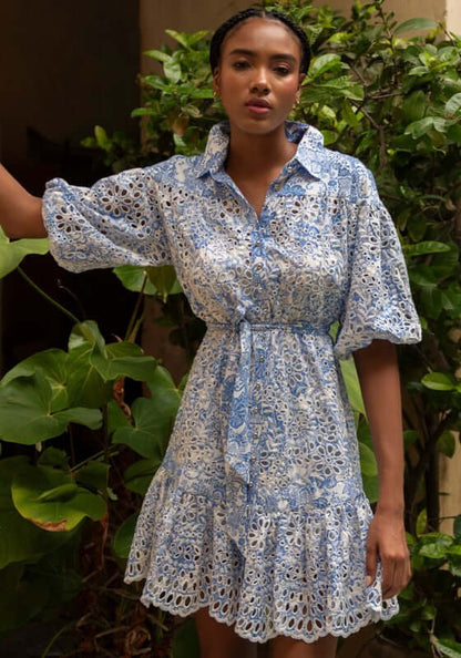 Look effortlessly chic in the Violeta Dress in Blue by resortwear designer Miss June.   In a chic blue and white print, this button down dress features 1/2 length sleeves, a scalloped hem with cut out embroidered detail and a self tie belt.   Available in one size fits UK 8-14.