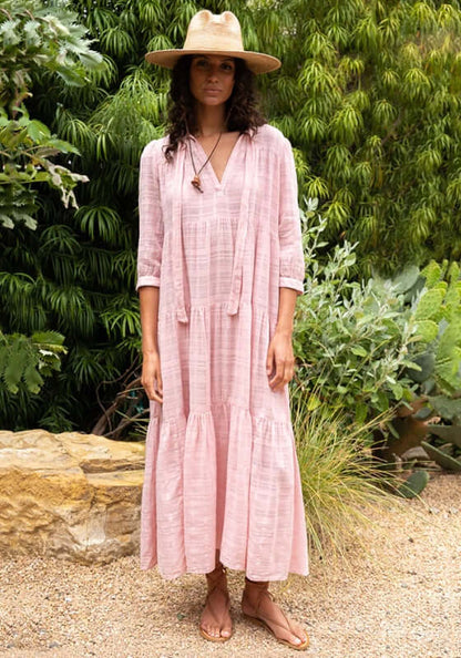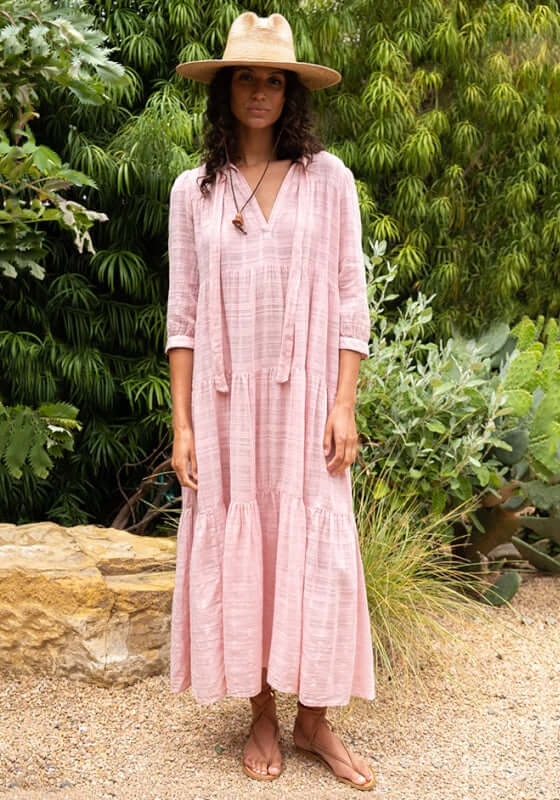 Enjoy a day spent in ultimate comfort thanks to the Window Pane Giselle Dress in Wildflower by beachwear designer Honorine. This maxi dress is made from a sheer textured cotton featuring a v neckline with ties and three quarter length sleeves, finished with a tiered skirt to create the perfect silhouette.