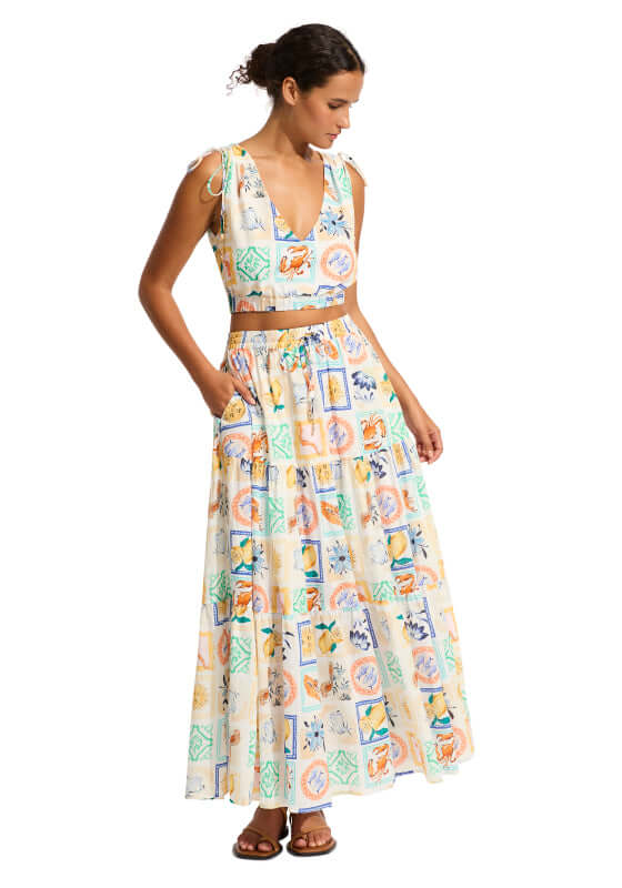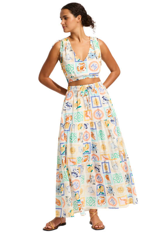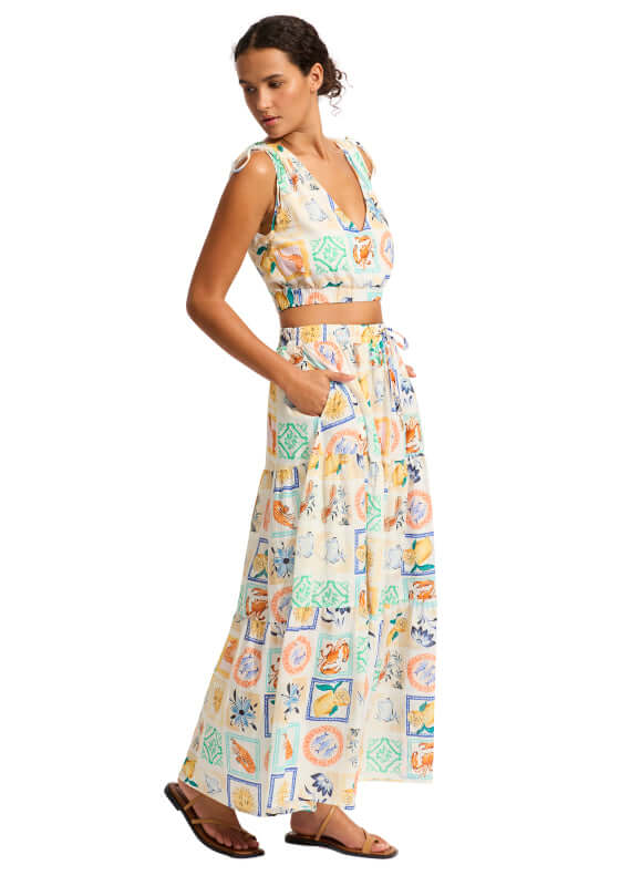 Make a statement in the beautiful Wish You Were Here Crop Top by beachwear designer Seafolly, in a pastel post card print. This cropped beach top features a v neckline with elasticated band for a flattering and comfortable fit. Paired with the matching skirt to complete the perfect go to holiday look.