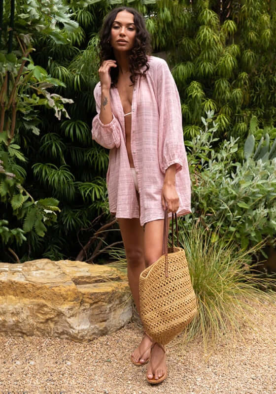 Complete your vacation look with the Wren Cover Up in Wildflower by beachwear designer Honorine. In a beach shirt style this cover up features a button up front with three quarter length sleeves. In a 100% breathable cotton this beach cover up with soon become you go to beach companion.